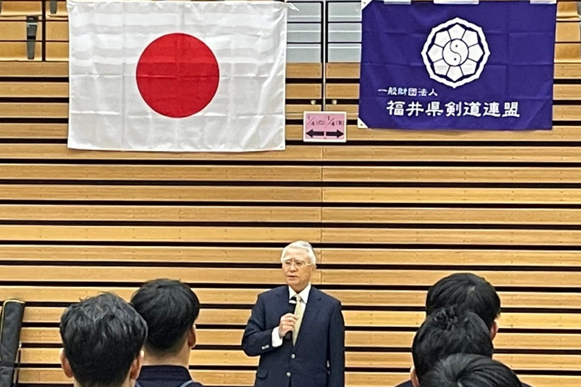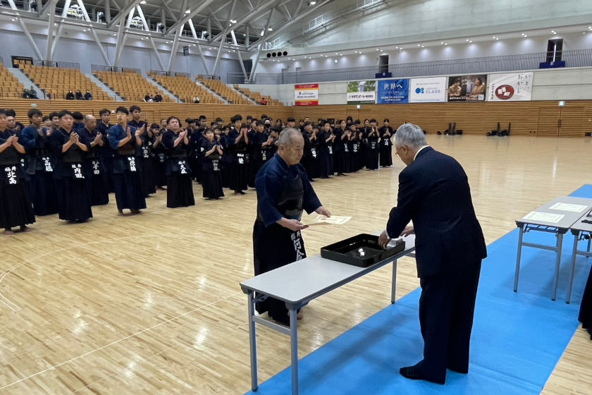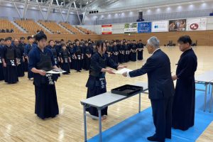 開会に先立ち、全日本剣道連盟「令和7年度剣道有功賞」を授賞された河合岩暢氏(福井県学校剣道連盟会長、三方地区)に片山会長から伝達授与と県剣連からの記念品が贈呈されました。また第63回北信越学生剣道新人大会団体優勝、同個人準優勝、第47回北信越女子学生剣道新人大会団体優勝、同個人優勝をされた福井工業大学剣道部の各選手に、代表して笠嶋洸瑠選手、谷口みか選手に(一財)福井県剣道連盟優秀選手賞が贈られました。
