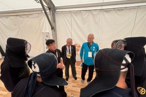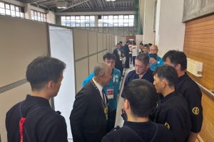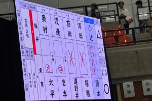 大会2日目成年男子第1試合東京戦。試合前に髙橋先生ならこう言うだろうなと思い、みんなに「負けたら、琵琶湖に〇〇〇ぞ!」と檄を飛ばしました。髙橋先生ほどの迫力が足りず、ややウケでした。茨城県から駆けつけてくださった佐藤成明先生が見守る中、試合が始まりました。