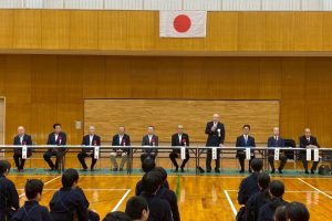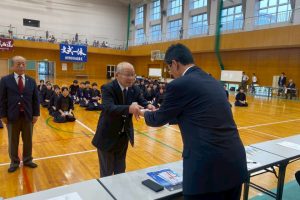 開会式後、今秋のねんりんピック岐阜2025に県代表として出場する奥井会長、上嶋副会長、谷口会員に市剣連から激励金が授与されました。